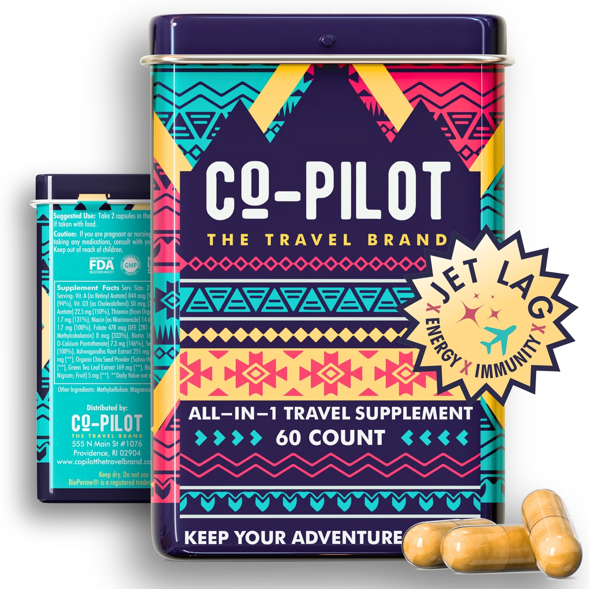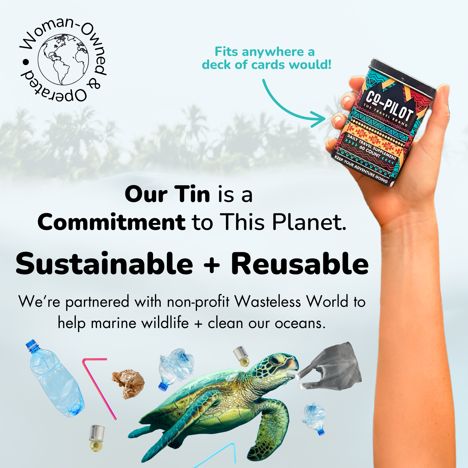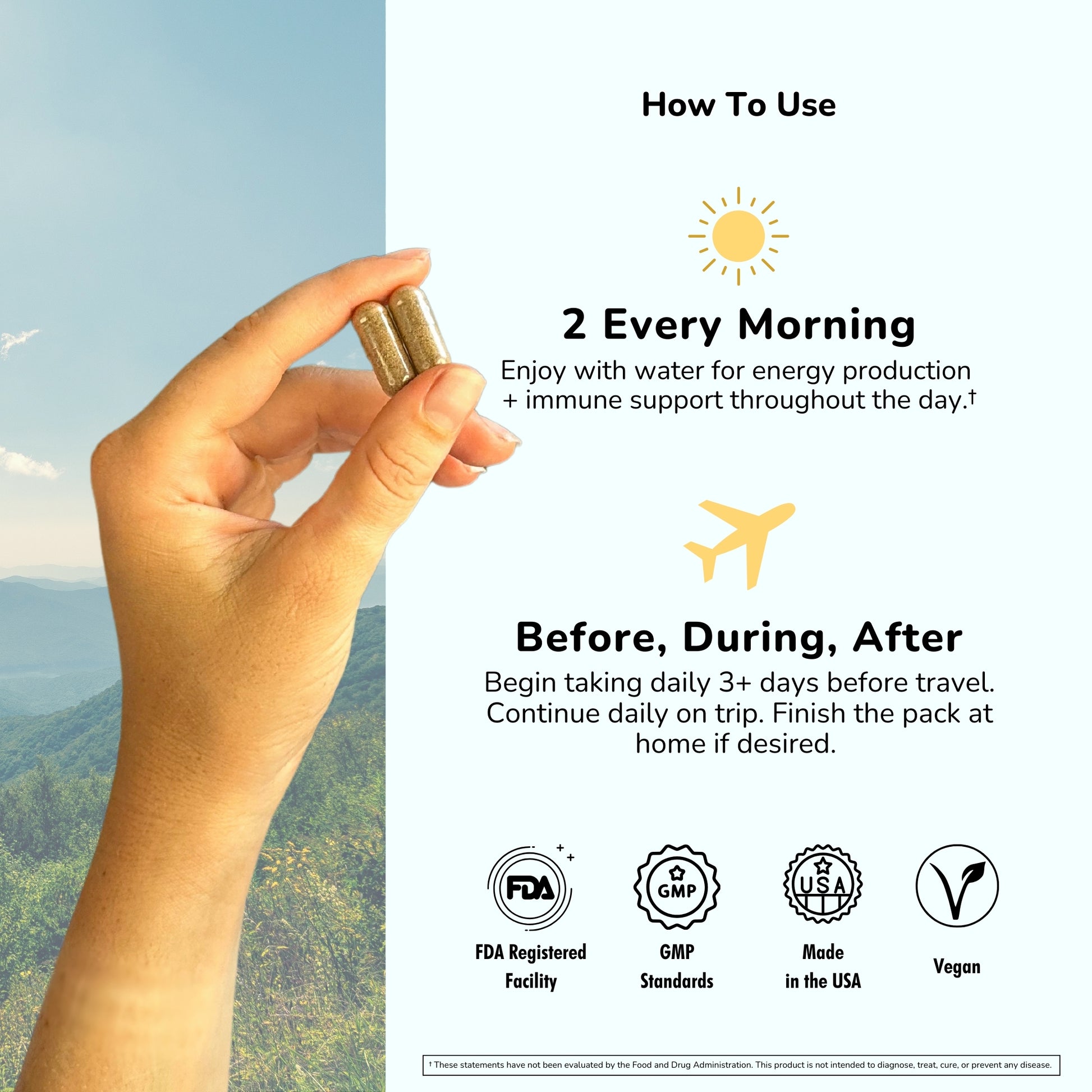 Take daily starting one week before travel, continue throughout your trip, and up to 90 days. Comes in a sleek, sustainable tin that fits in your carry-on.