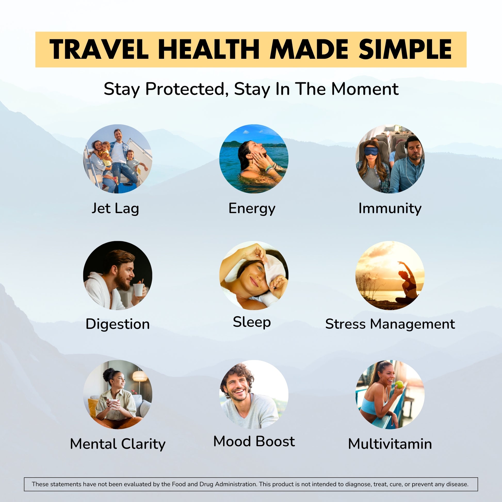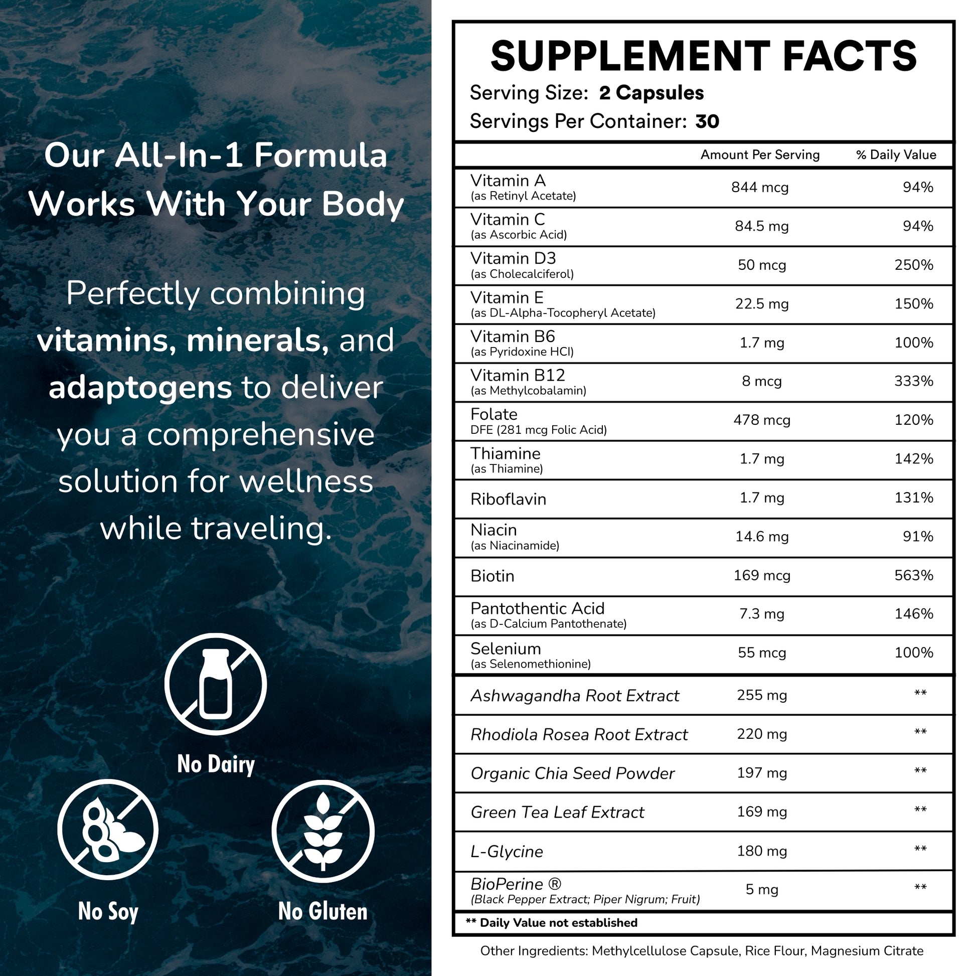 Travel farther, feel better. Our all-in-one, plant-powered formula delivers 20 essential vitamins, nutrients, and trace minerals to keep you energized, balanced, and healthy on every journey.